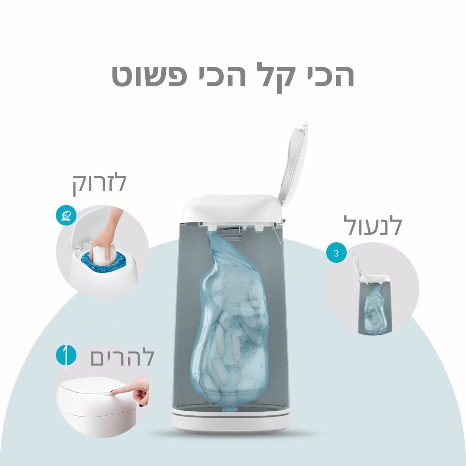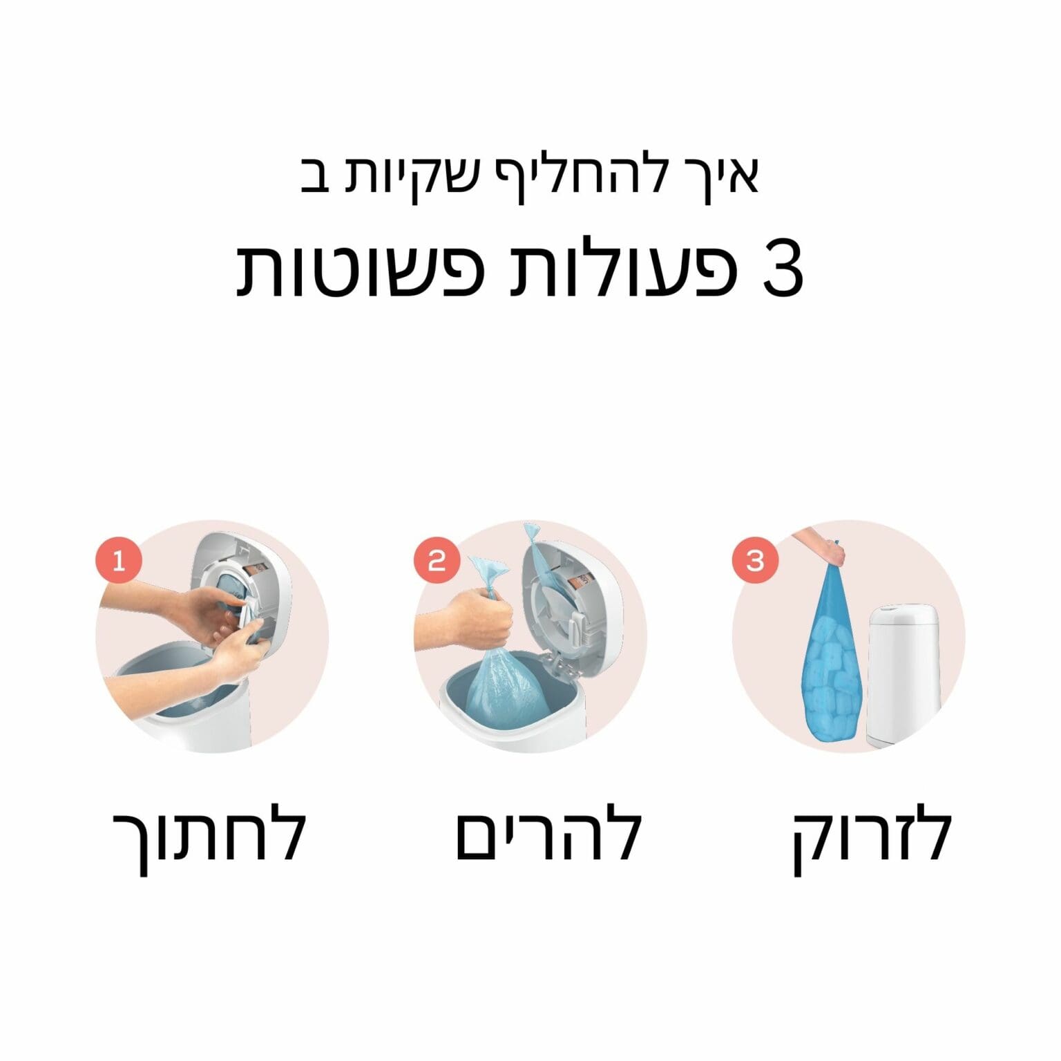 מכניסים את החיתול דרך הפתח העליון. מנגנון פנימי עוטף אותו בשכבת פלסטיק אטומה. החיתולים נאגרים בתחתית בלי לפתוח את הפח בכל שימוש. כשרוצים להחליף מחסנית – מוציאים ומכניסים חדשה בקלות, בלי מגע עם הפסולת.