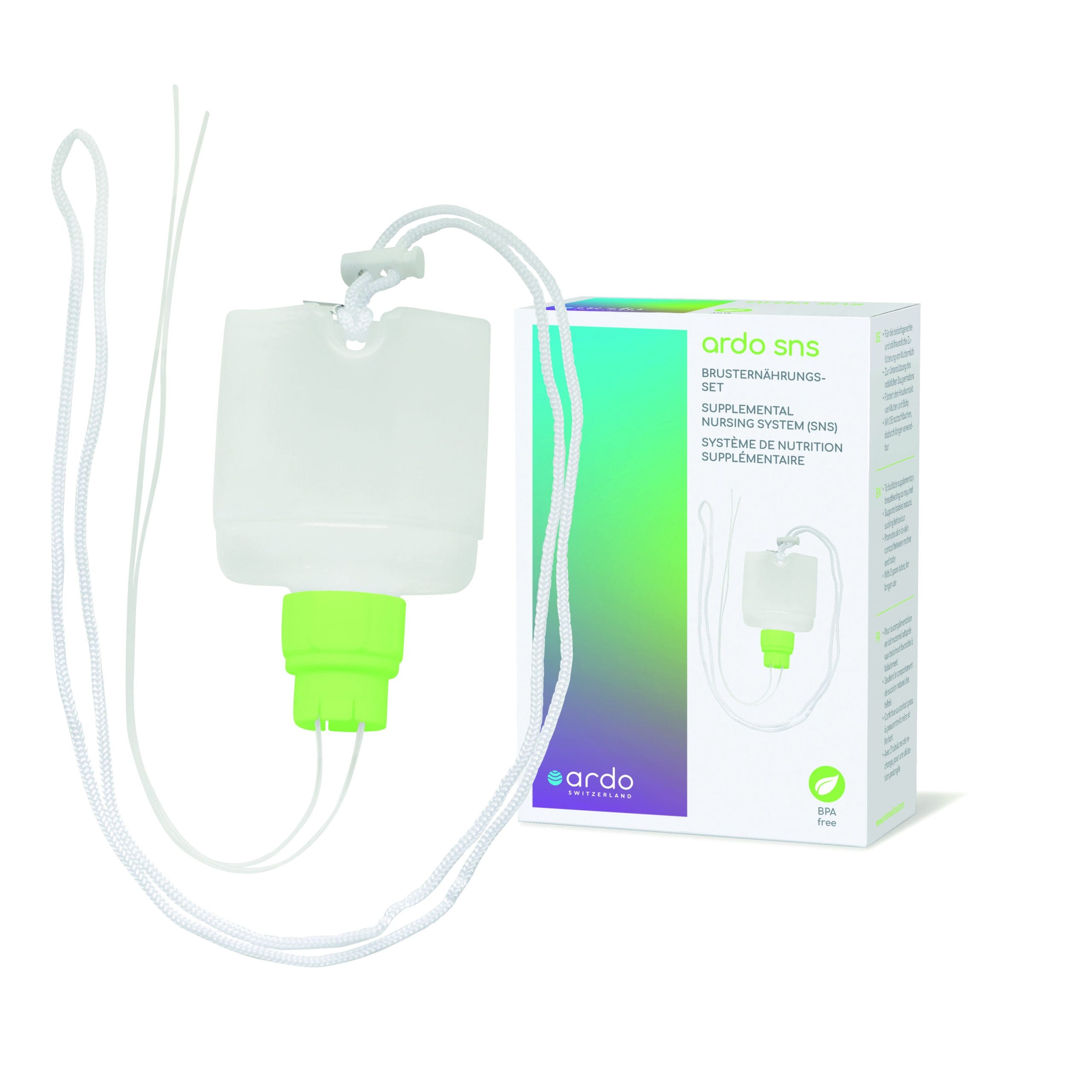 מערכת העזר להנקה Ardo SNS (Supplemental Nursing System) מאפשרת הזנה משלימה של חלב אם שאוב או תמ"ל ישירות על השד, תוך כדי יניקת התינוק.